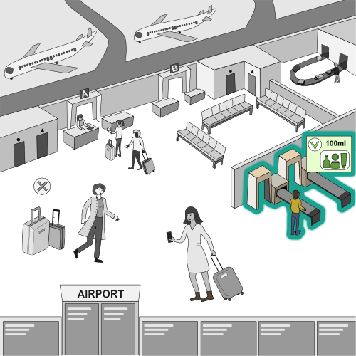 Use the image to visualize the action. Picture the person placing liquids into a clear plastic bag. Make the image do work for you.